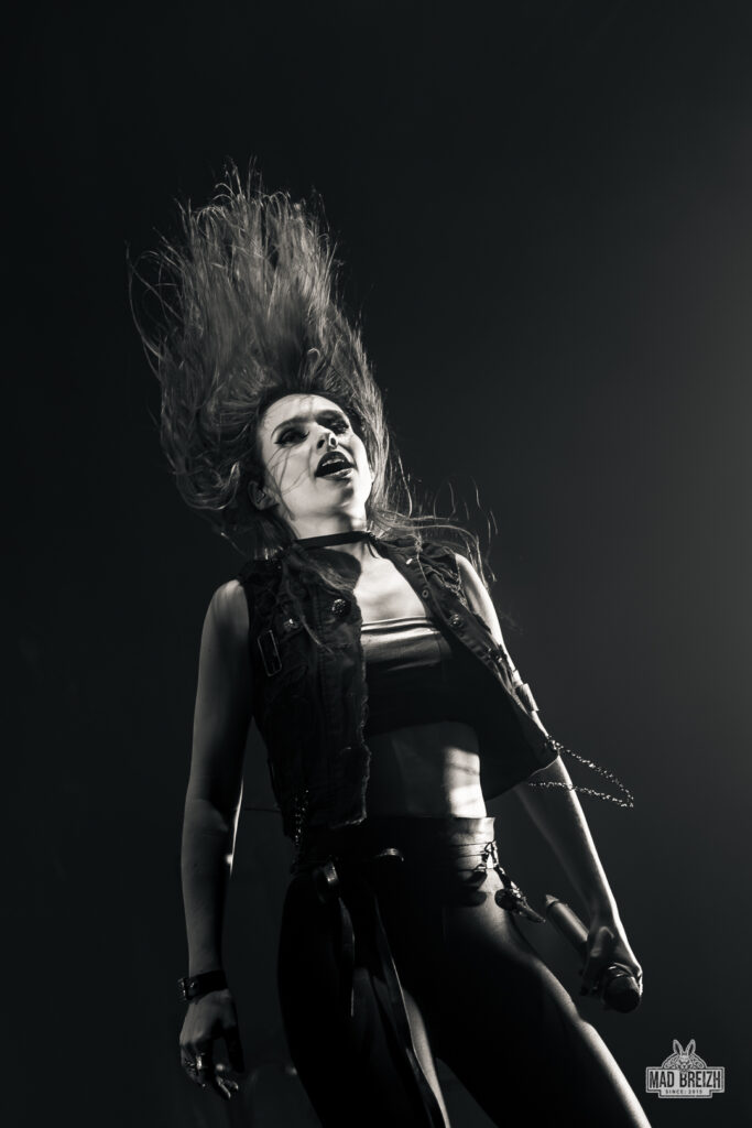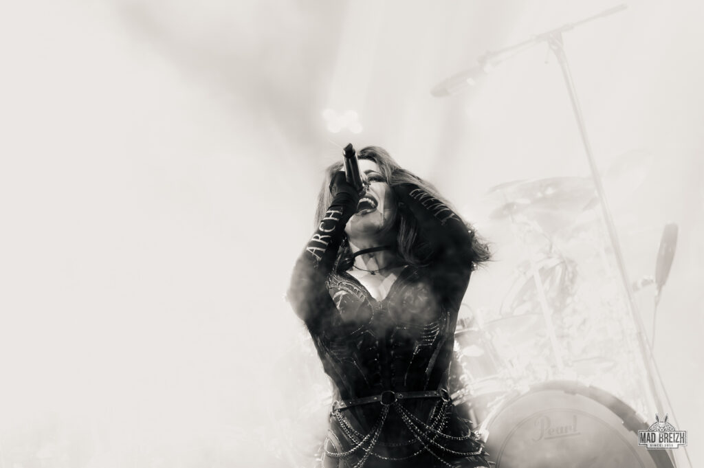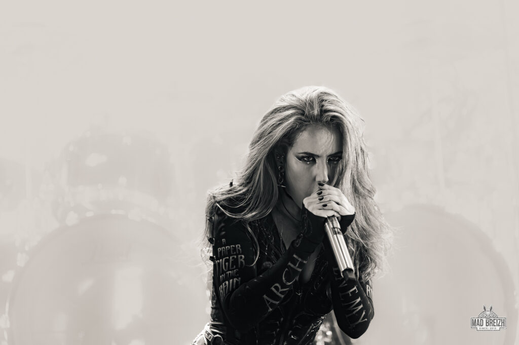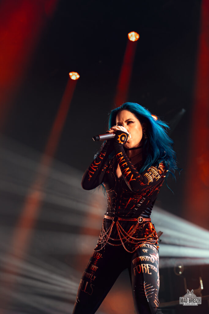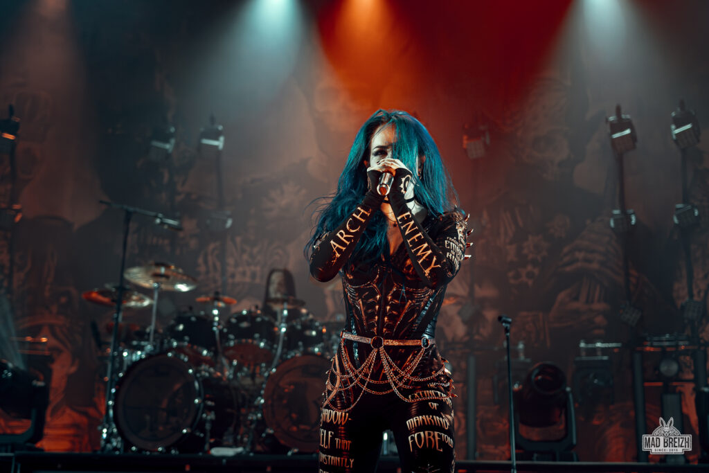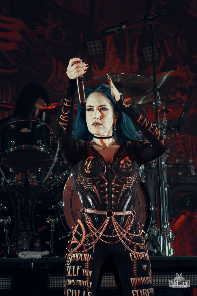 Alissa White-Gluz, au chant, a livré une performance vocale impressionnante, alternant growls incisifs et passages clairs avec une présence scénique magnétique. La setlist, d’une durée d’environ 1h25, a été un savant mélange entre les classiques du groupe et les nouveautés, avec des morceaux comme Blood Dynasty et Nemesis qui ont électrisé la salle.